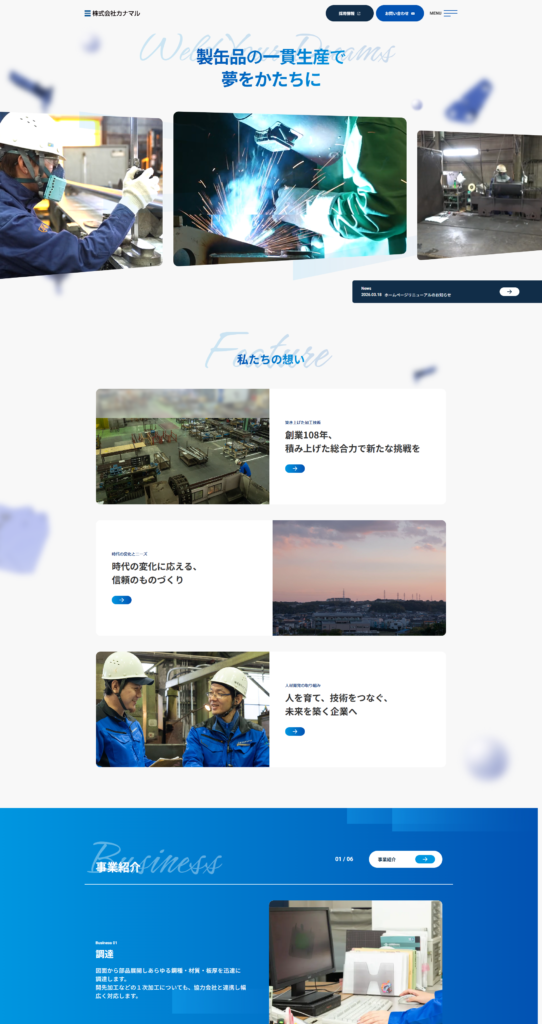 課題は、1917年創業の重厚な歴史と、20代が躍動する現場の熱量をどう共存させるかでした。デザインにあたっては、社内で数百の参考サイトを検証し、カナマル様と協議を重ね、「さわやかだが、軽すぎない」質感を追求しています。